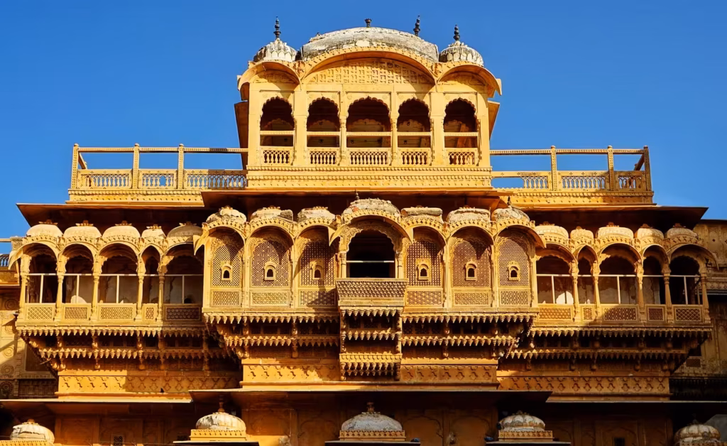 Jaisalmer es famosa por el majestuoso Fuerte de Jaisalmer, también conocido como Sonar Quila (Fuerte Dorado), uno de los pocos fuertes habitados del mundo. Sus havelis ornamentadas, como Patwon Ki Haveli y Salim Singh Ki Haveli, muestran una exquisita artesanía y detallados balcones tallados en piedra.