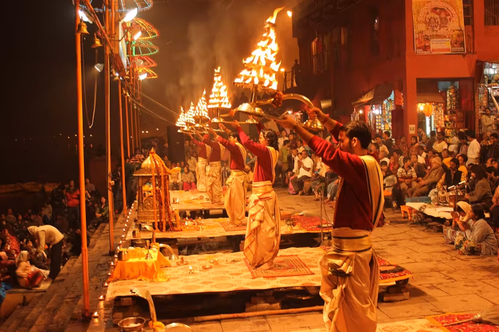 Los ghats de Varanasi son el alma de la ciudad. Al amanecer, los rituales y oraciones crean una atmósfera mágica, mientras que por la noche la ceremonia Ganga Aarti ilumina el río con fuego, cantos y devoción.